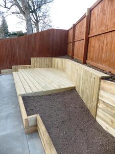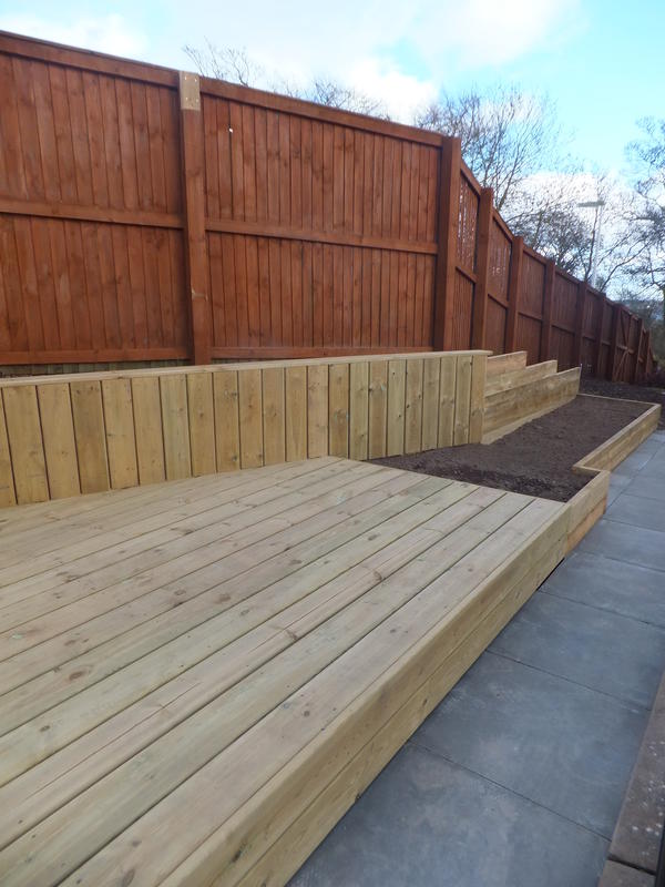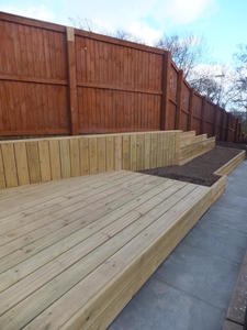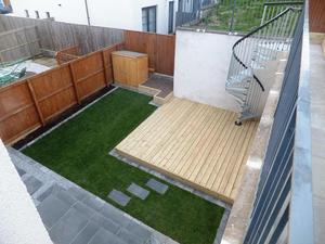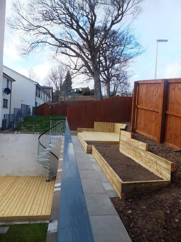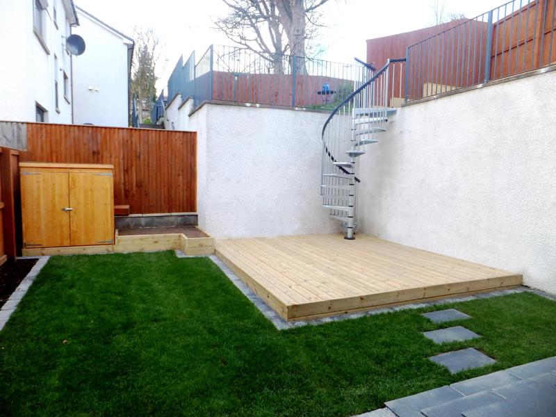 Our Dundee clients had an area of ground which was 3 metres above their main garden and unused due to it's sloping nature and access from street side. The unused upper garden could be an asset to the home if taking advantage of the elevated position within a densely populated modern estate of 3 storey town houses. We suggested joining both levels with an external spiral staircase to compliment the clients desire for a contemporary look in keeping with the modern building and it's architectural feature's. The lower garden was modernised with black limestone paving replacing the old buff concrete slabs and the new lawn was edged with limestone cobbles, a deck and planter completed the lower garden. The upper garden slope was excavated, retained and a suitable level surface created to allow for a reasonably sized deck. Timber planters and an access path were added and of course the Mediterranean style spiral staircase.