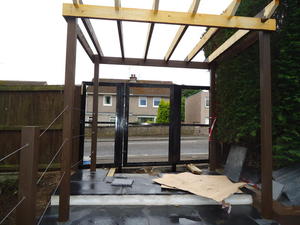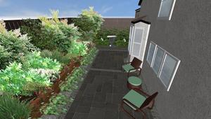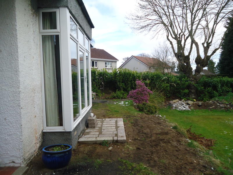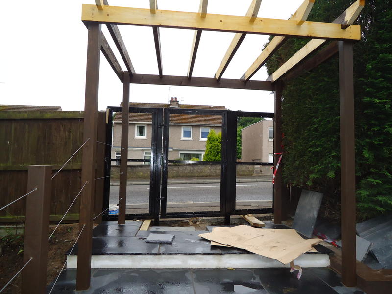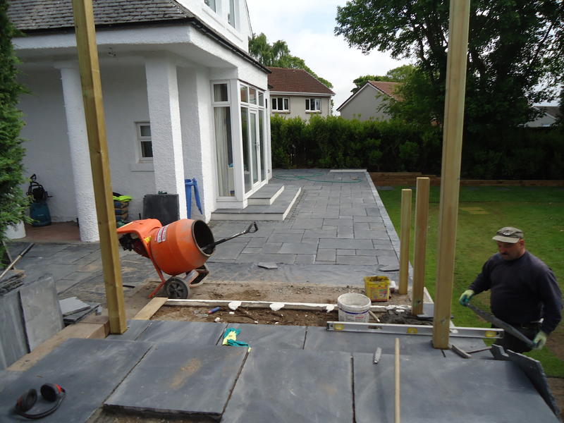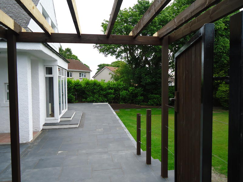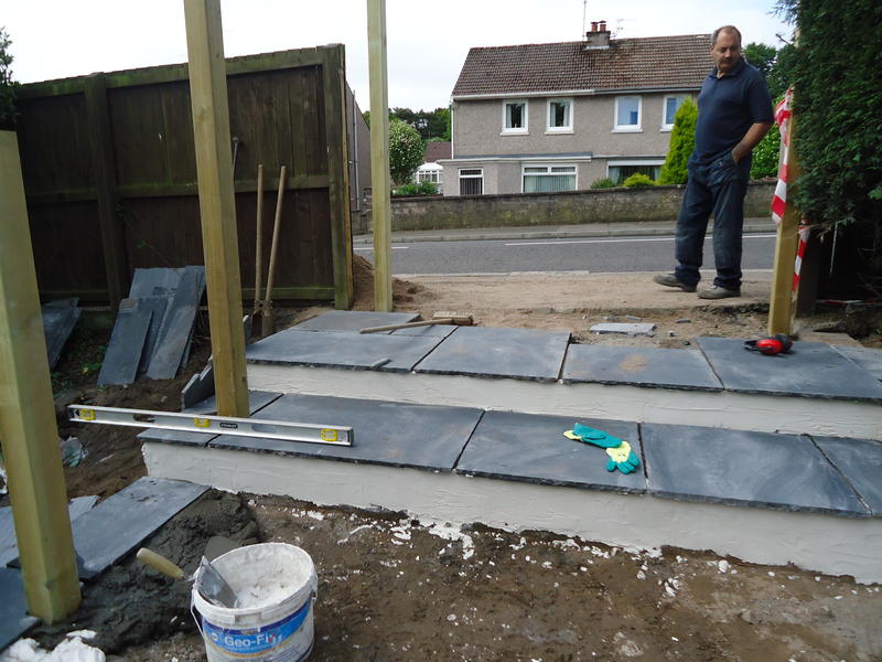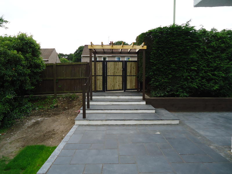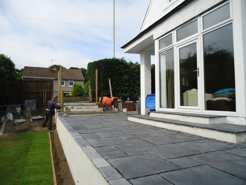 Our Dundee clients had just completed an extension to the house front and tasked us to design the surrounding terraces with associated steps, retaining walls, gate and entry steps which was currently sloped with a tarmac finish. The new patio doors required steps to comply with building regs and a wider terrace was asked for to the house front to provide amenity space. The new raised terrace would require a substantial retaining wall.
