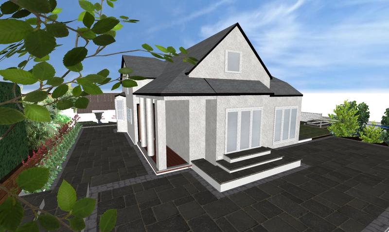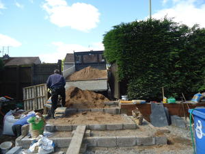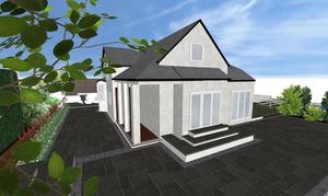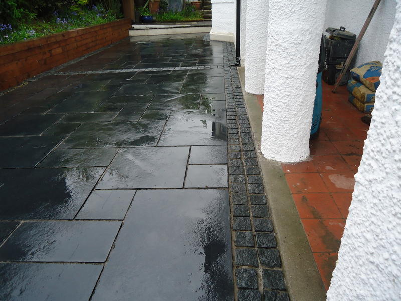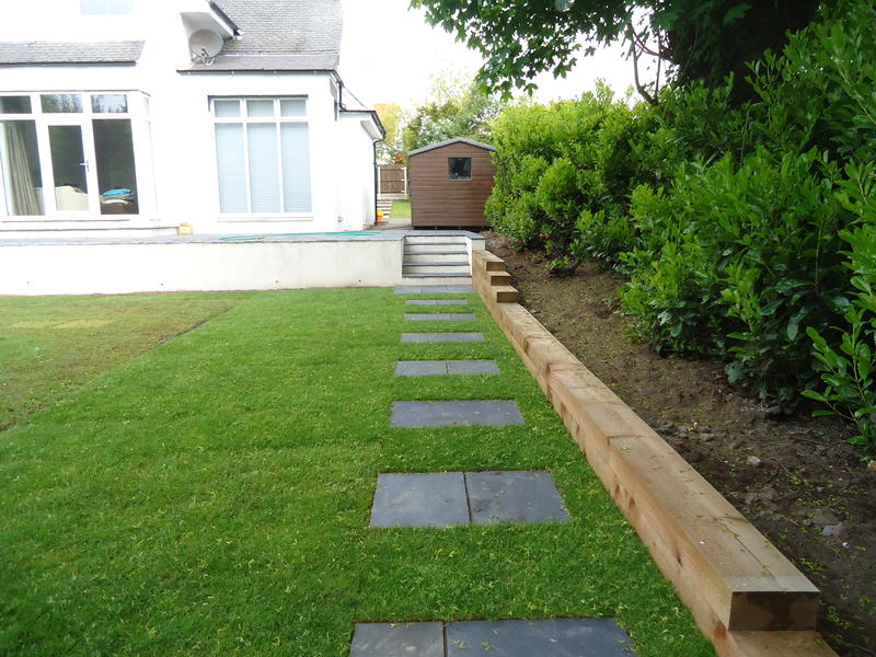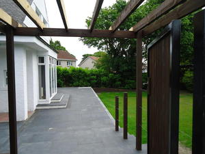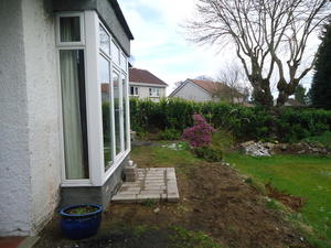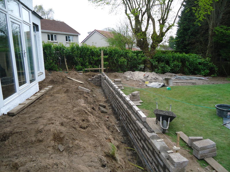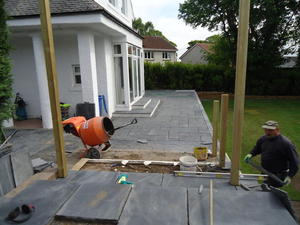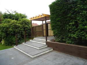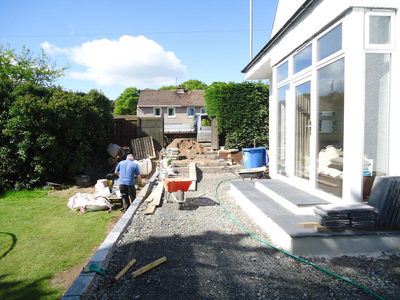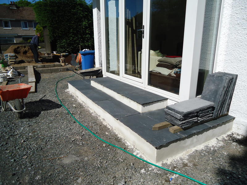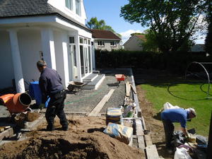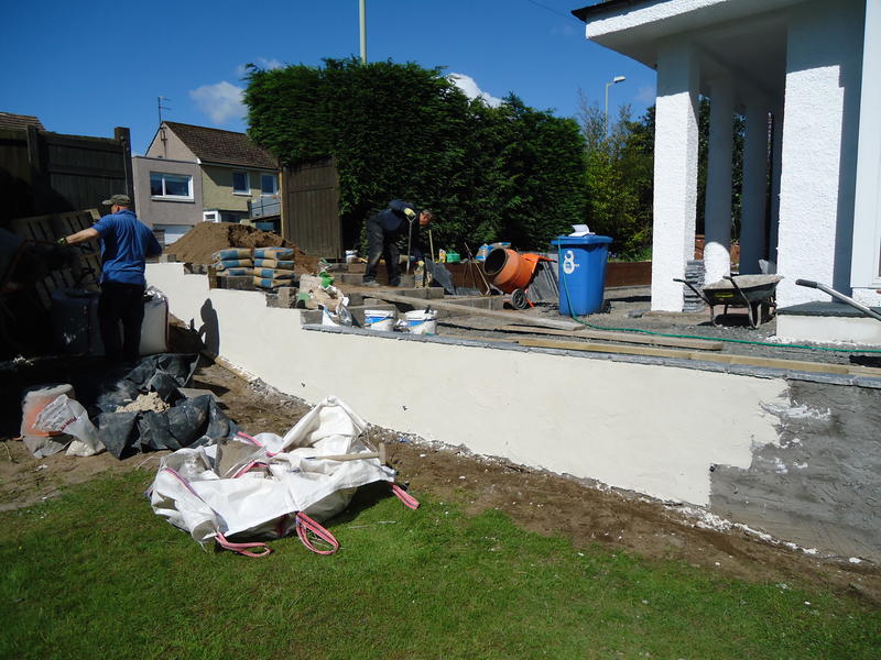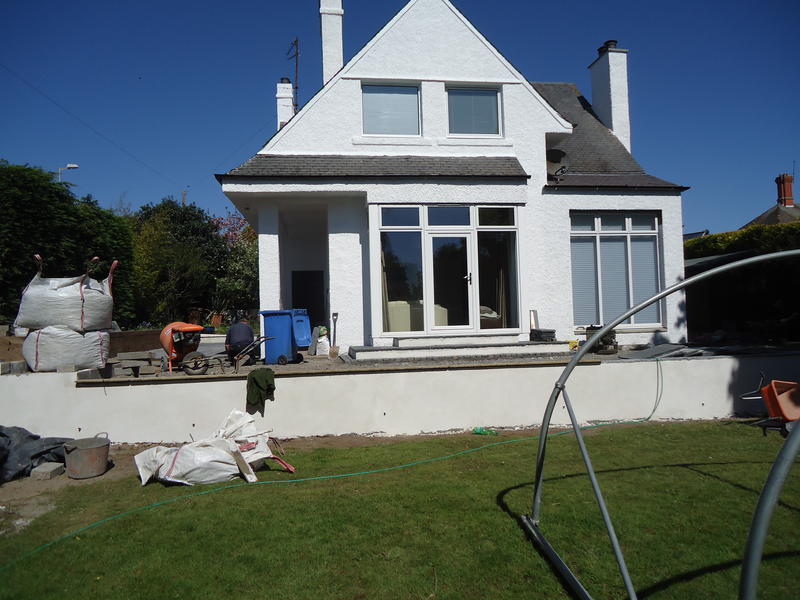 Major works to provide feature entrance steps, feature patio door steps and substantial retaining walls and associated steps and paving.